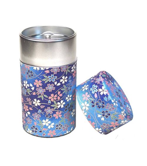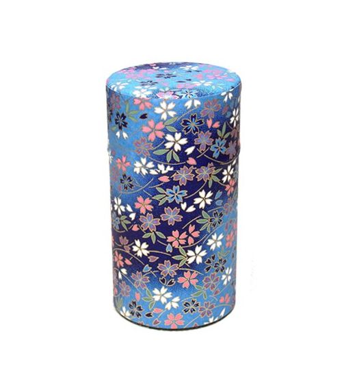 Cette boîte à thé washi est ornée de motifs roses et verts représentant des fleurs japonaises sur un fond bleu.