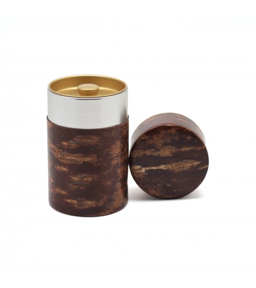 Boîte à thé japonaise en écorce de cerisier et métal. Son double couvercle hermétique protège les saveurs du thé et préserve ses feuilles de la lumière et de la chaleur.