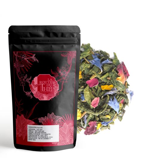Dans un grand pichet en verre, écraser au pilon une dizaine de feuilles de menthe fraîche lavées et ajouter 4 cuillerées à café de votre thé vert Cavaliers Bleus.