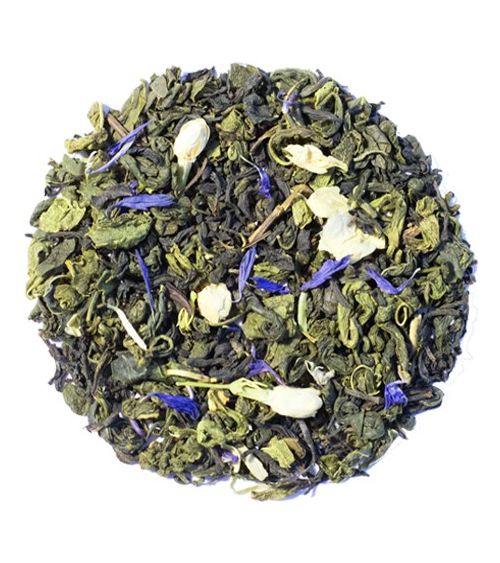 Mélange de thé vert, de thé noir et de thé blanc Yin Zhen, agrémenté de fleurs de jasmin, de pétales de bleuet aromatisé à la bergamote.