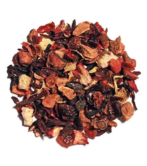 Un mélange de fleurs d’hibiscus et d’hélianthe, agrémenté de morceaux de pomme, d’écorces de cynorhodon et d’orange, accompagné de fruits d’été.