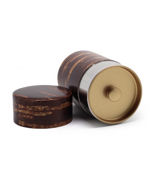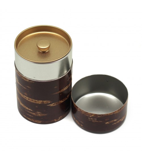 Boîte à thé en écorce de cerisier, intérieur métallique, dotée d’un double couvercle hermétique permettant de conserver toutes le vertus et la qualité des feuilles de thé.