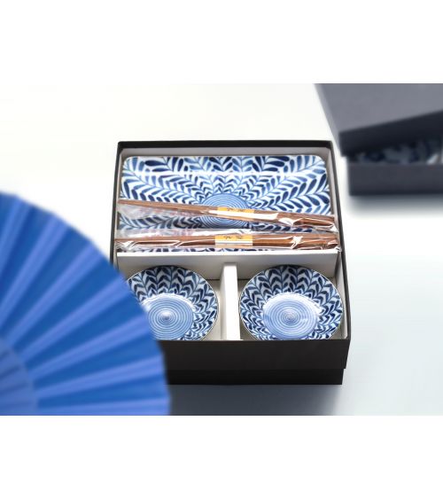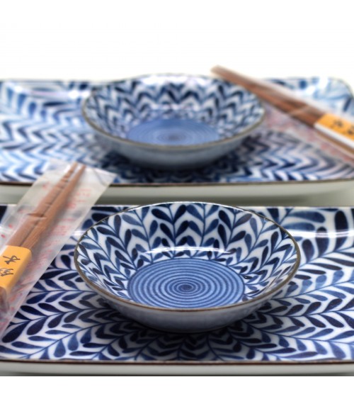 Comprenant deux assiettes, deux coupelles et deux paires de baguettes japonaises en bois.