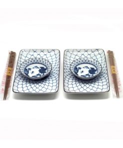 Comprenant deux assiettes, deux coupelles et deux paires de baguettes japonaises en bois.