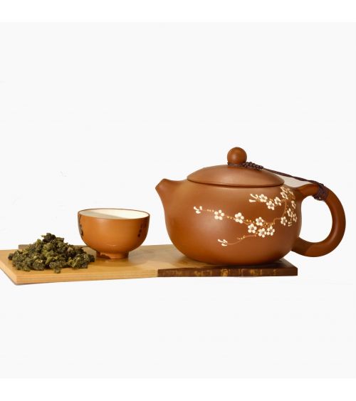 Théière Yixing en argile rouge de forme Xi Shi classique, aux fins motifs de fleurs de cerisier, filtre emaillé à la main intégré, idéale pour les thés sombres et puissants selon la méthode du Gong Fu Cha.
